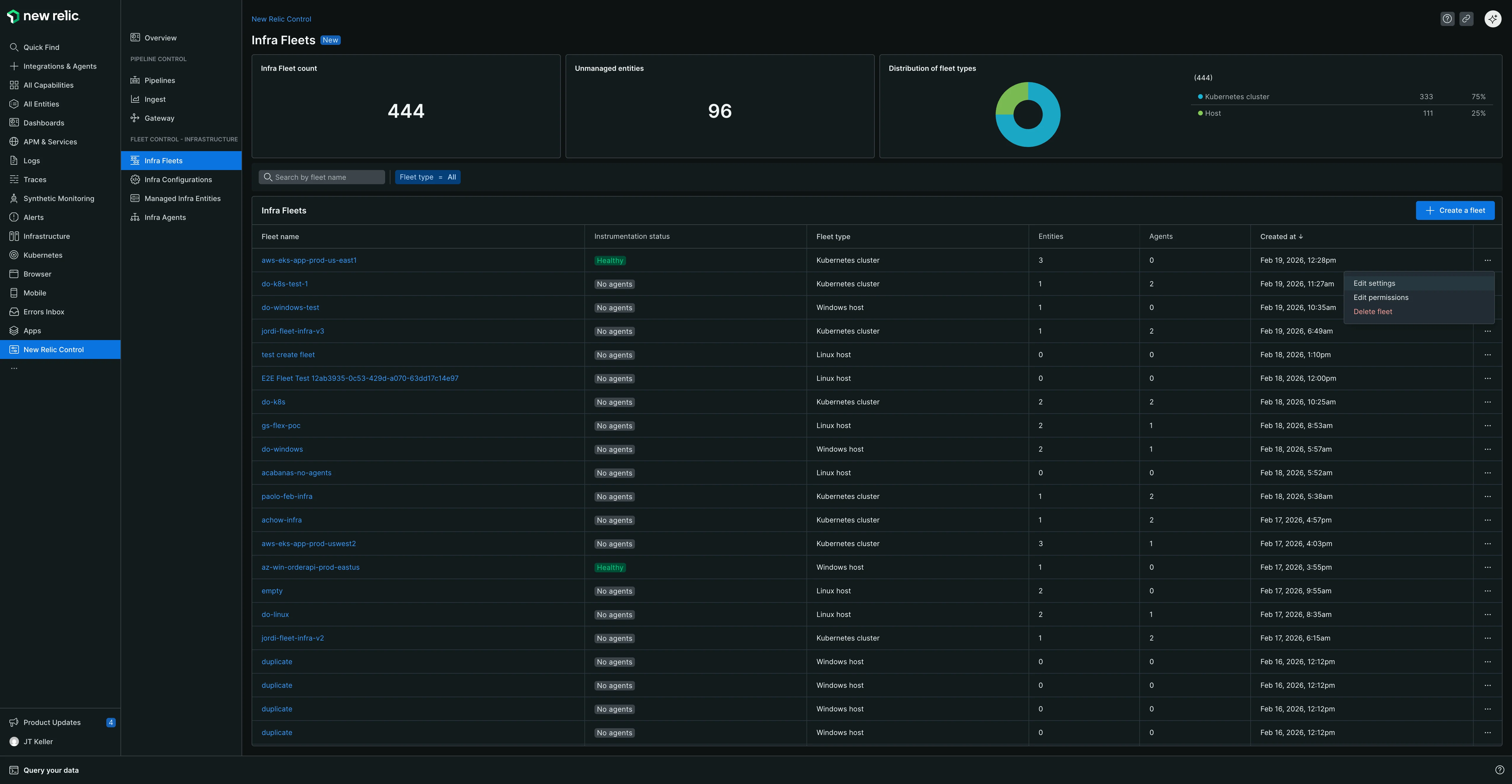 When you navigate to New Relic Control β Fleets, you land on the main Fleets page, which provides a high-level overview of your entire Fleet Control environment. From here, you can: