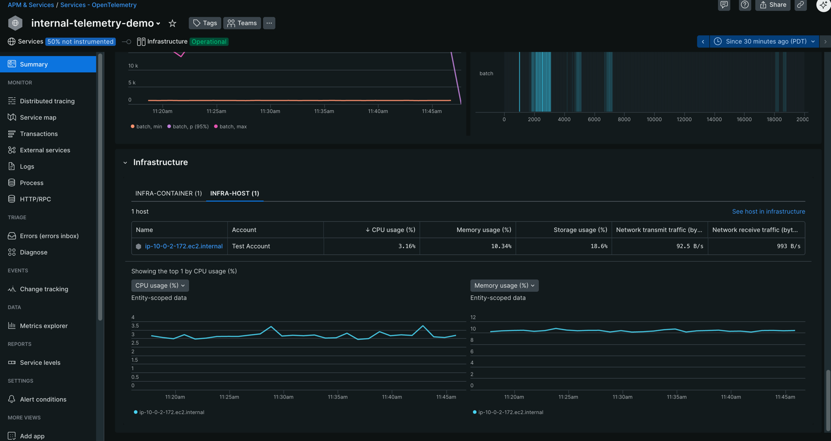 As shown above, APM can show infrastructure metrics for the infrastructure the collector is running on but only if your infrastructure is instrumented and a relationship can be formed. The relationship is driven by additional attributes on the collector's internal telemetry. You can read more about this topic in our OTel documentation. The steps to set this up heavily depend on your exact infrastructure. For the common choice of Kubernetes we created an example that showcases how to achieve container-to-service relationships based on our OTel for Kubernetes solution.