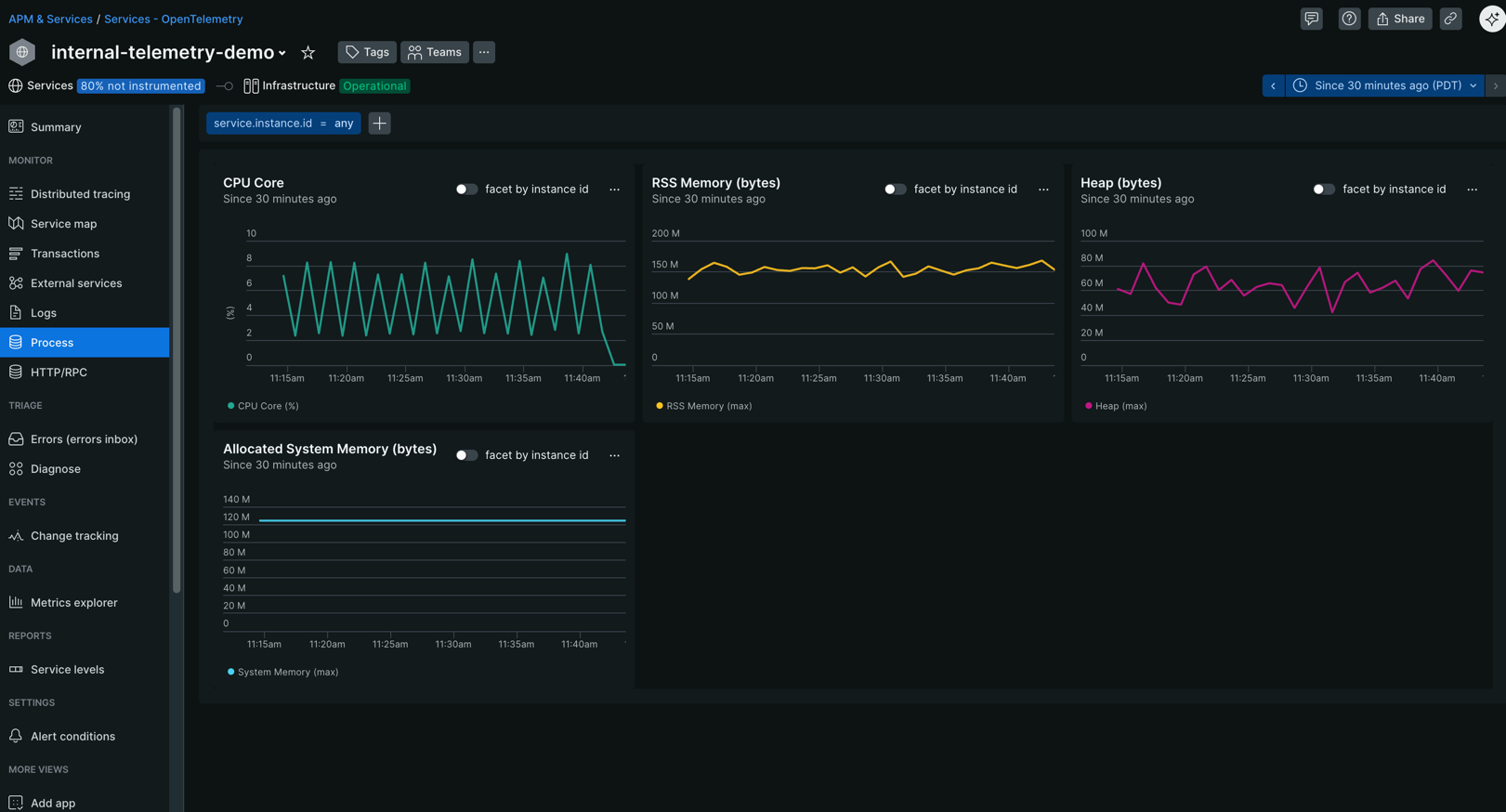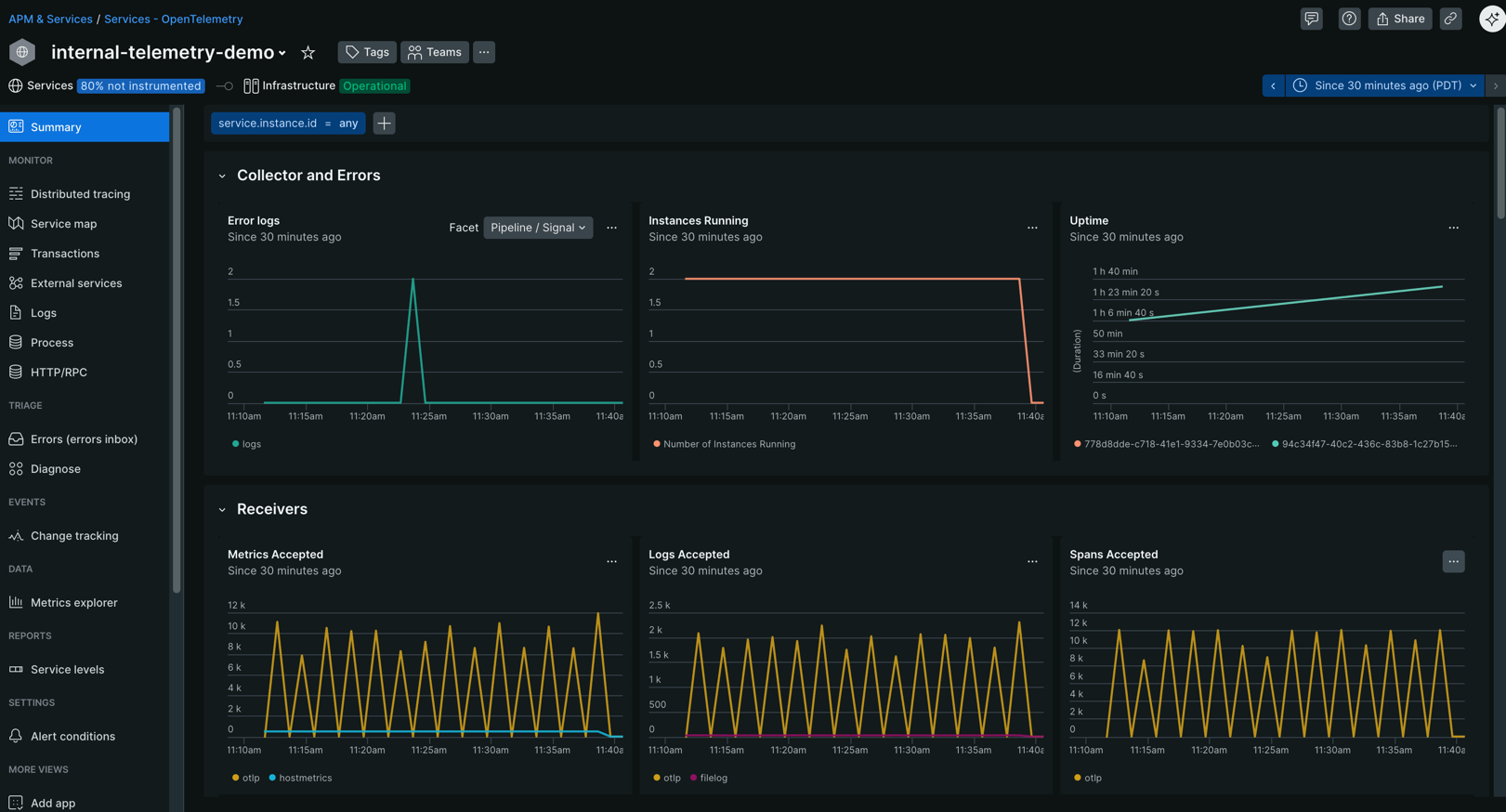 To view your collector's internal telemetry, navigate to APM & Services > Services - OpenTelemetry > your_collector_name to explore the collector's entity.