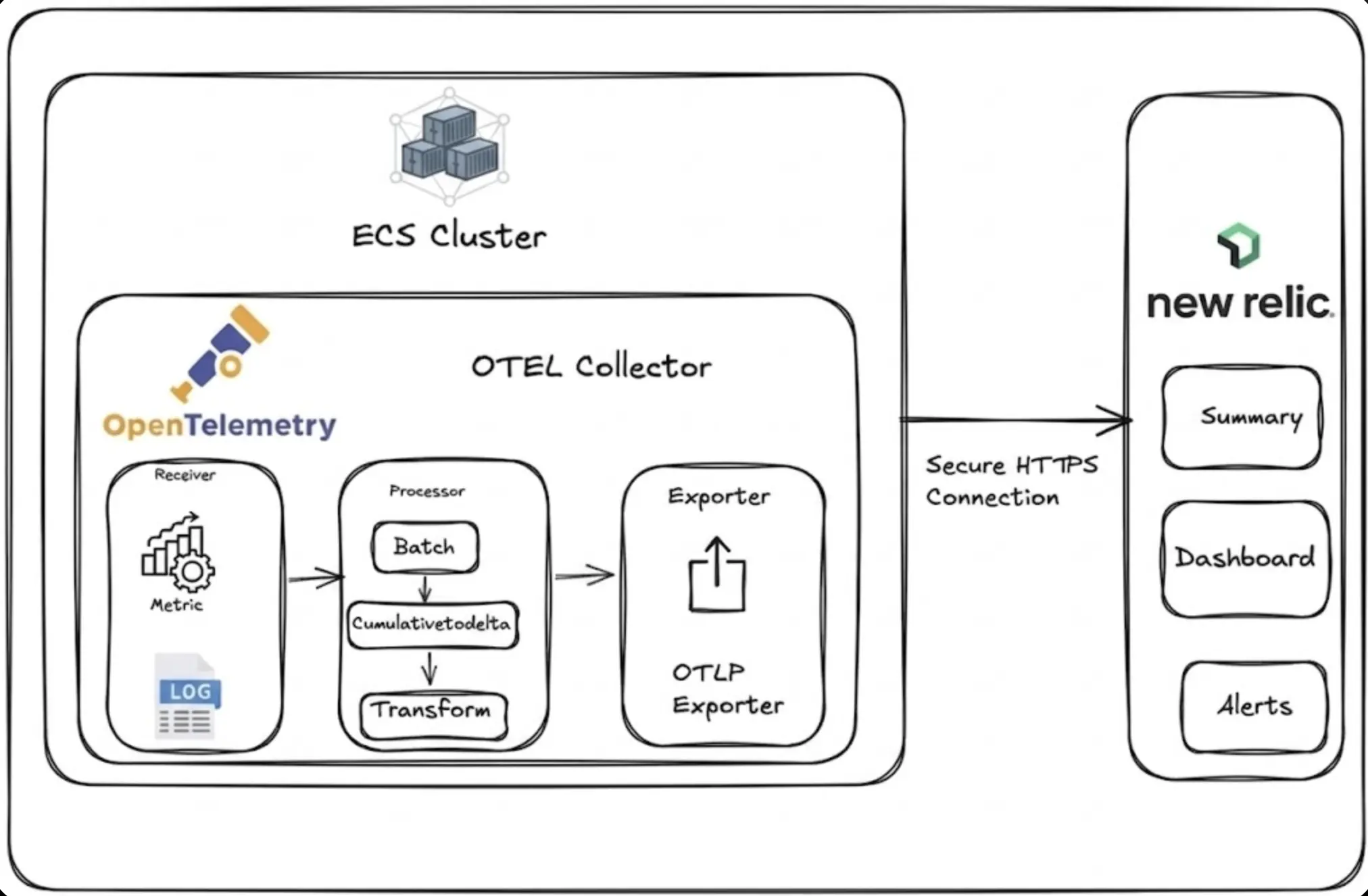 The OpenTelemetry Collector runs as a sidecar container in your ECS task definitions to collect comprehensive metrics: