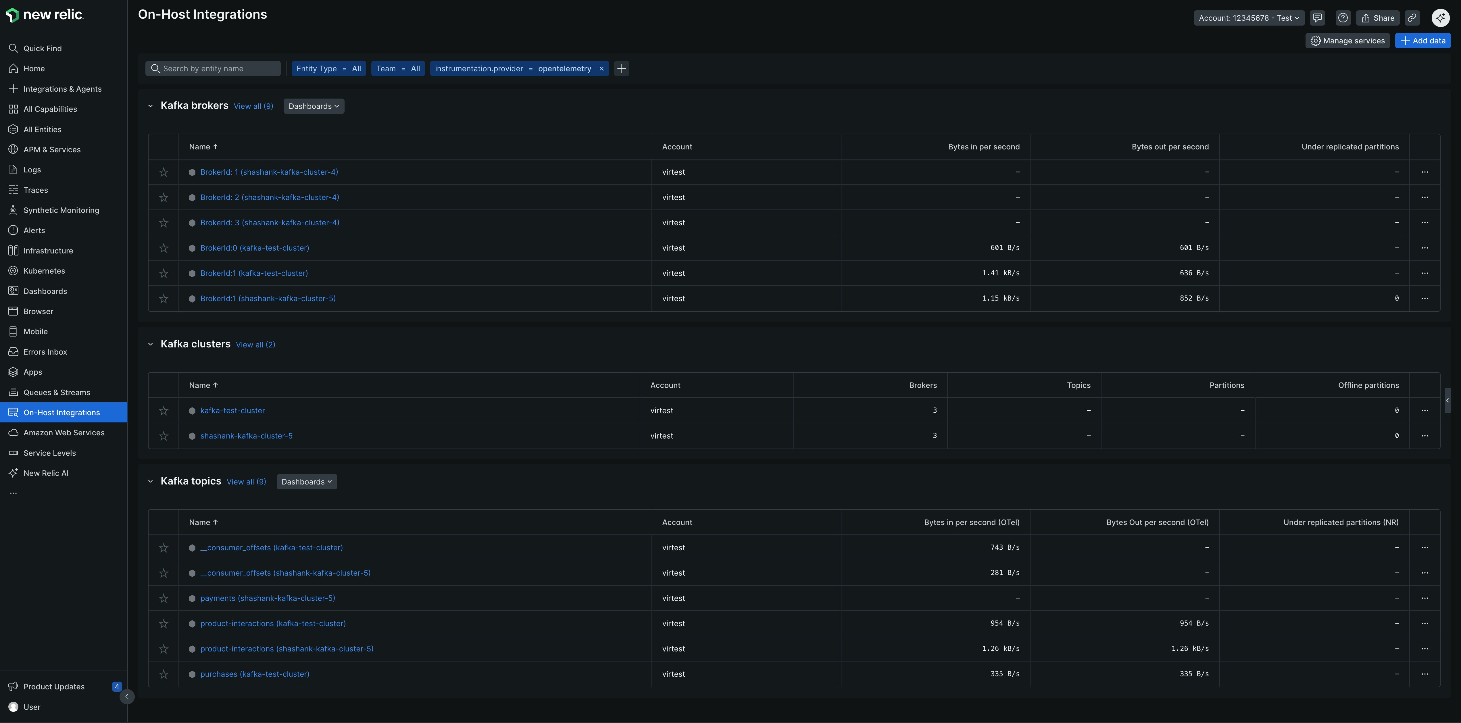 Once your Kafka monitoring is configured with OpenTelemetry, your metrics will appear across multiple locations in New Relic. This guide shows you where to find your data and how to query it effectively.