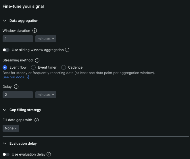 Si vous souhaitez que New Relic attende une durée spécifique avant de commencer à évaluer le seuil par rapport à votre signal, activez cette fonctionnalité et définissez le temps d'attente souhaité. |
