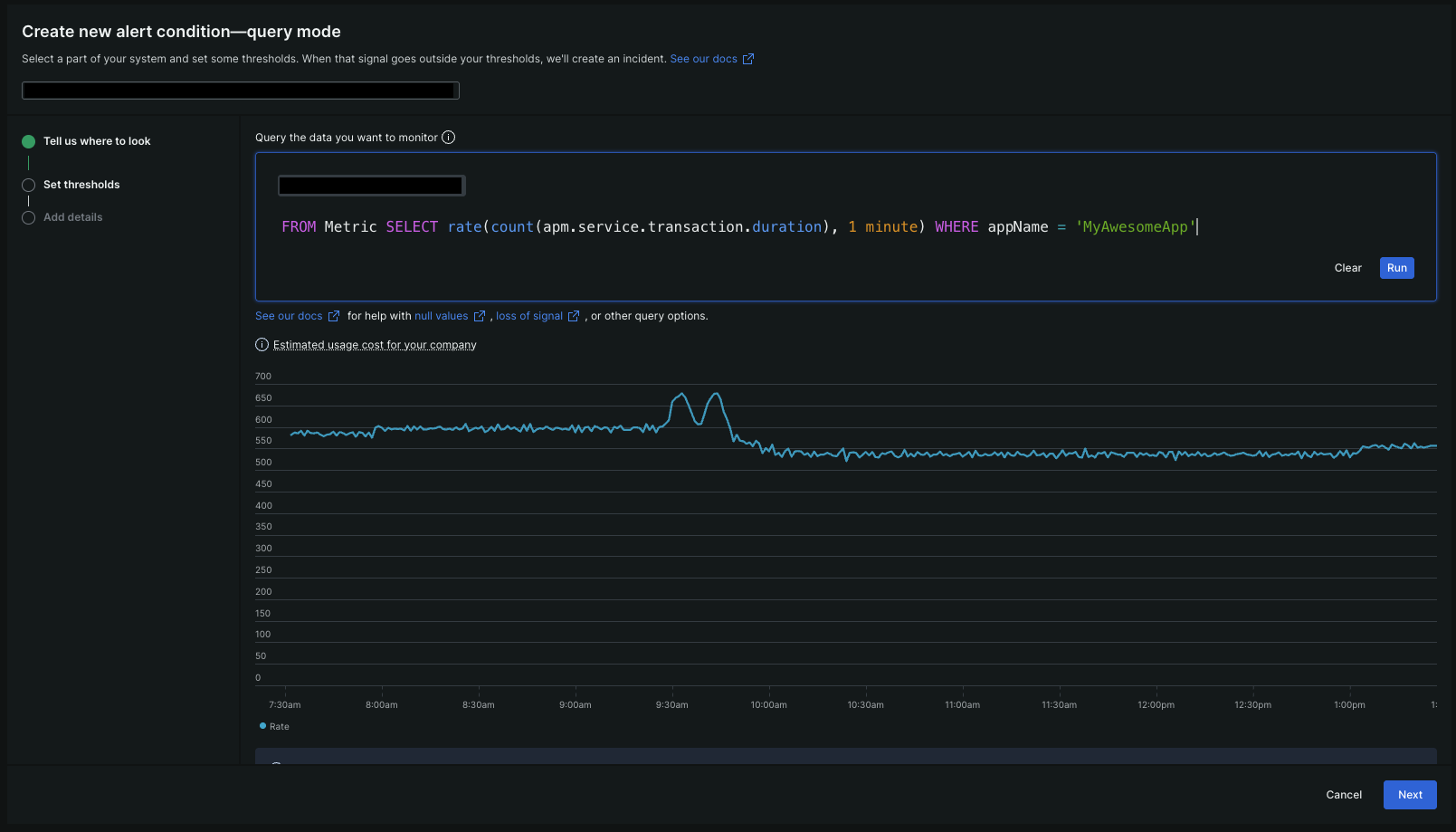 Pour définir votre signal d’alerte, sélectionnez Write your own query et composez votre requête NRQL. Voici un exemple de requête pour votre référence qui vous donnera le débit de l'application