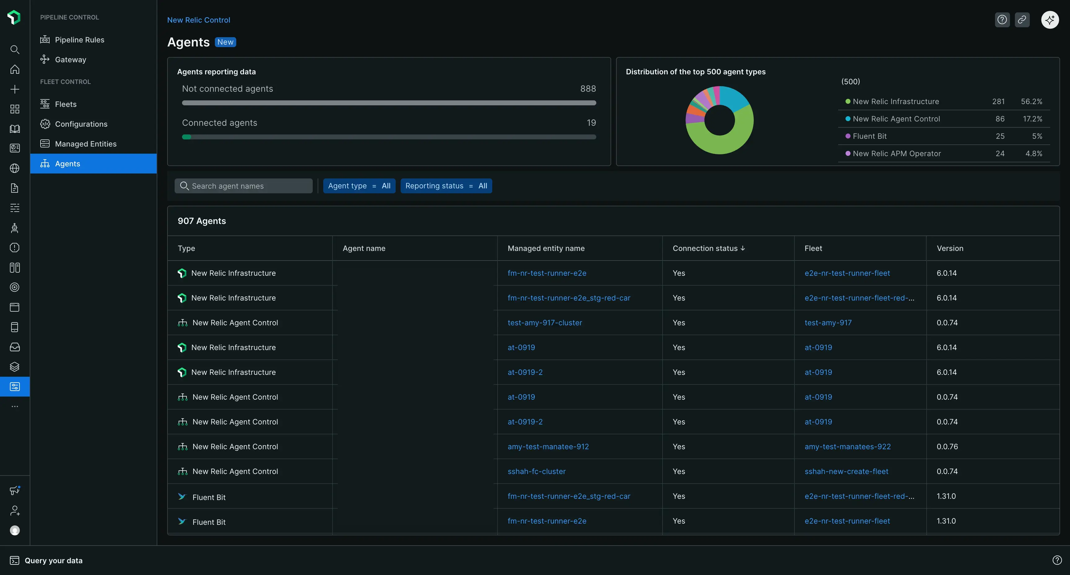 When you navigate to New Relic Control → Agents, you get a global overview of all the agents being managed by Fleet Control across your organization.