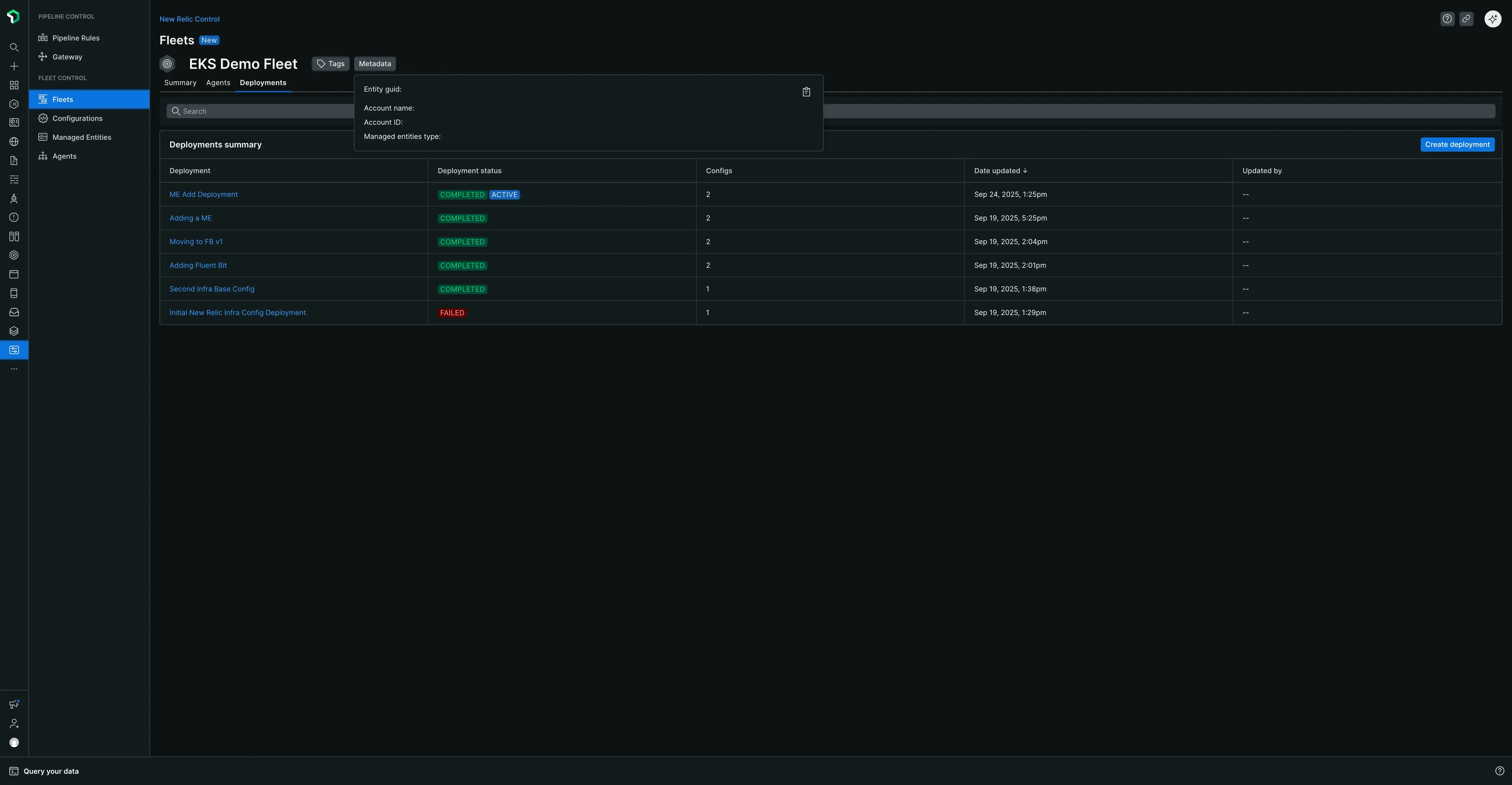 • Metadata: Clicking this displays the core identifying details for the fleet as a New Relic entity, such as its Entity guid, Account ID, and Managed entities type.