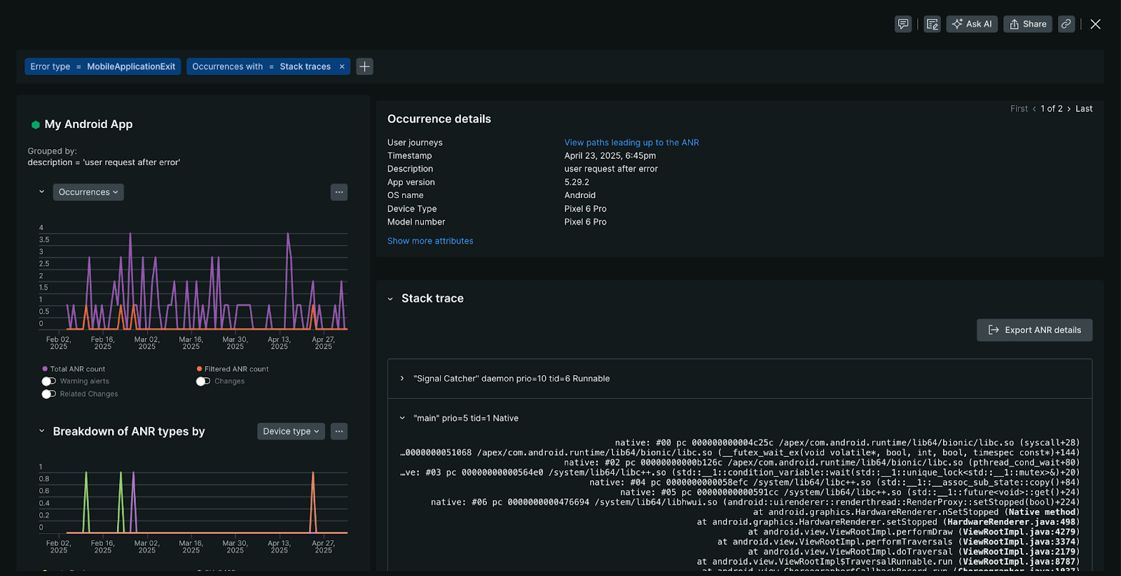 Quando ocorre um erro ANR, o Android captura um stack trace. Um stack trace é um instantâneo do caminho de execução do código no momento do erro. New Relic recupera esses rastreamentos stack usando o Android ApplicationExitInfo#getTraceInputStream API método. Se um stack trace estiver disponível, New Relic o exibirá abaixo dos detalhes da ocorrência do ANR.